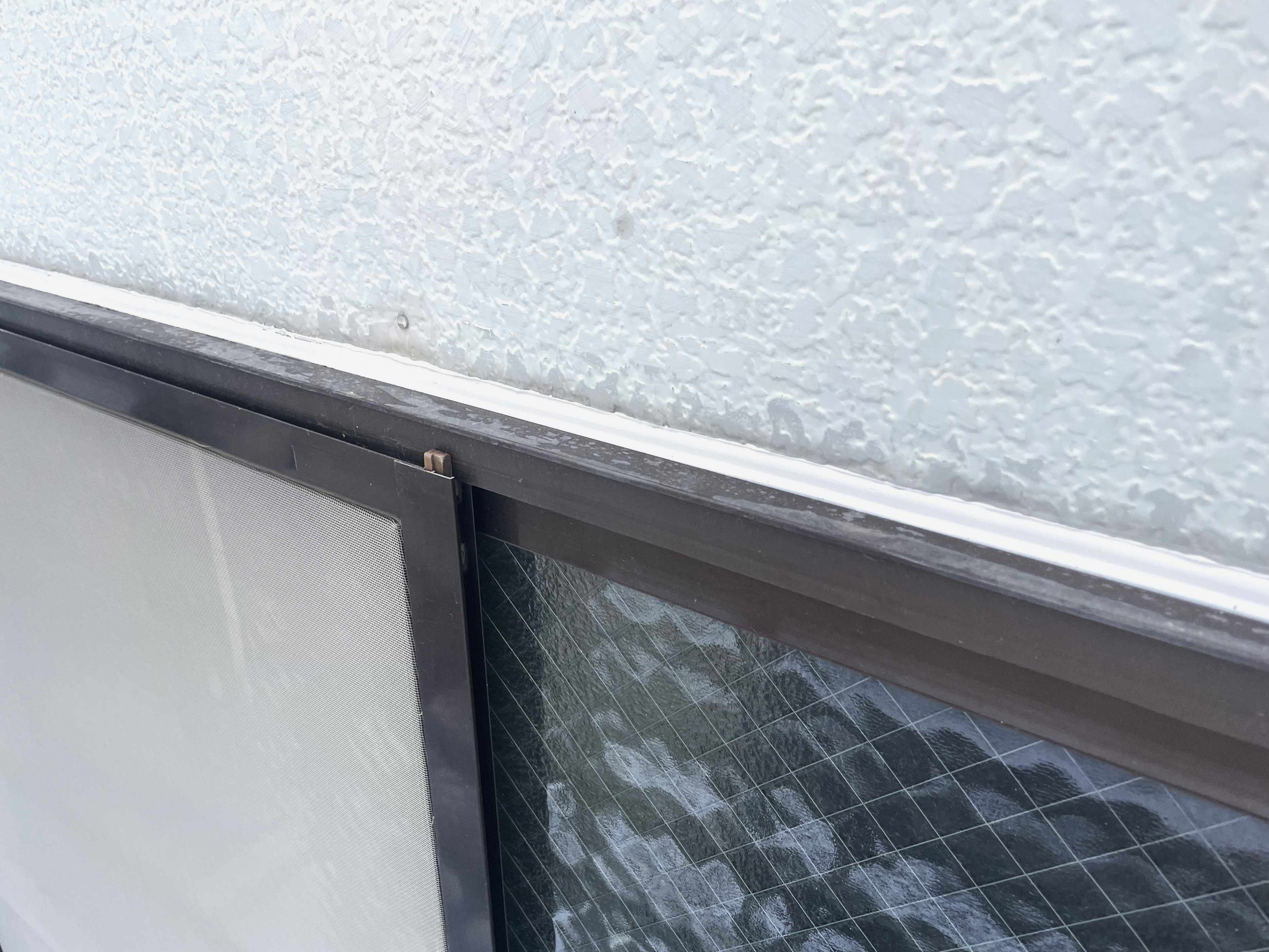 サッシ周り等の劣化が著しく進行しており、高圧洗浄を行うと雨漏りに繋がる恐れがあったので、高圧洗浄の前にコーキング、ケレン処理を行いました。