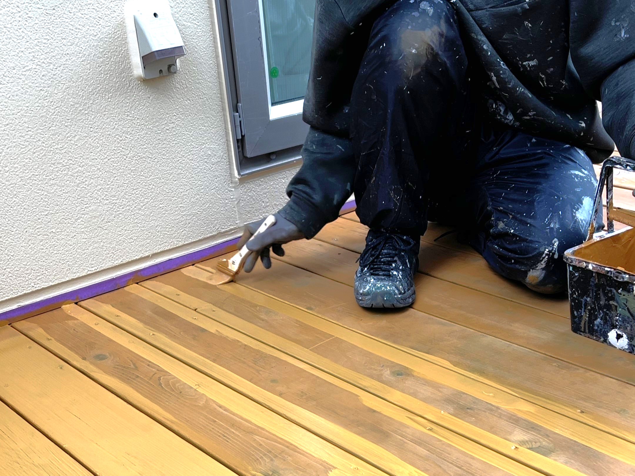 細かな箇所は刷毛を使用しながら、ローラーで木材保護専用の塗料をウッドデッキ全体に塗布します。今回使用した塗料は造膜タイプなので、使われている材種によっては木目が消えてしまう事もあります。